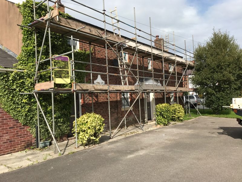 Scaffolding set up around residential buildings to provide safe access and support for workers during construction, renovation, or maintenance tasks.